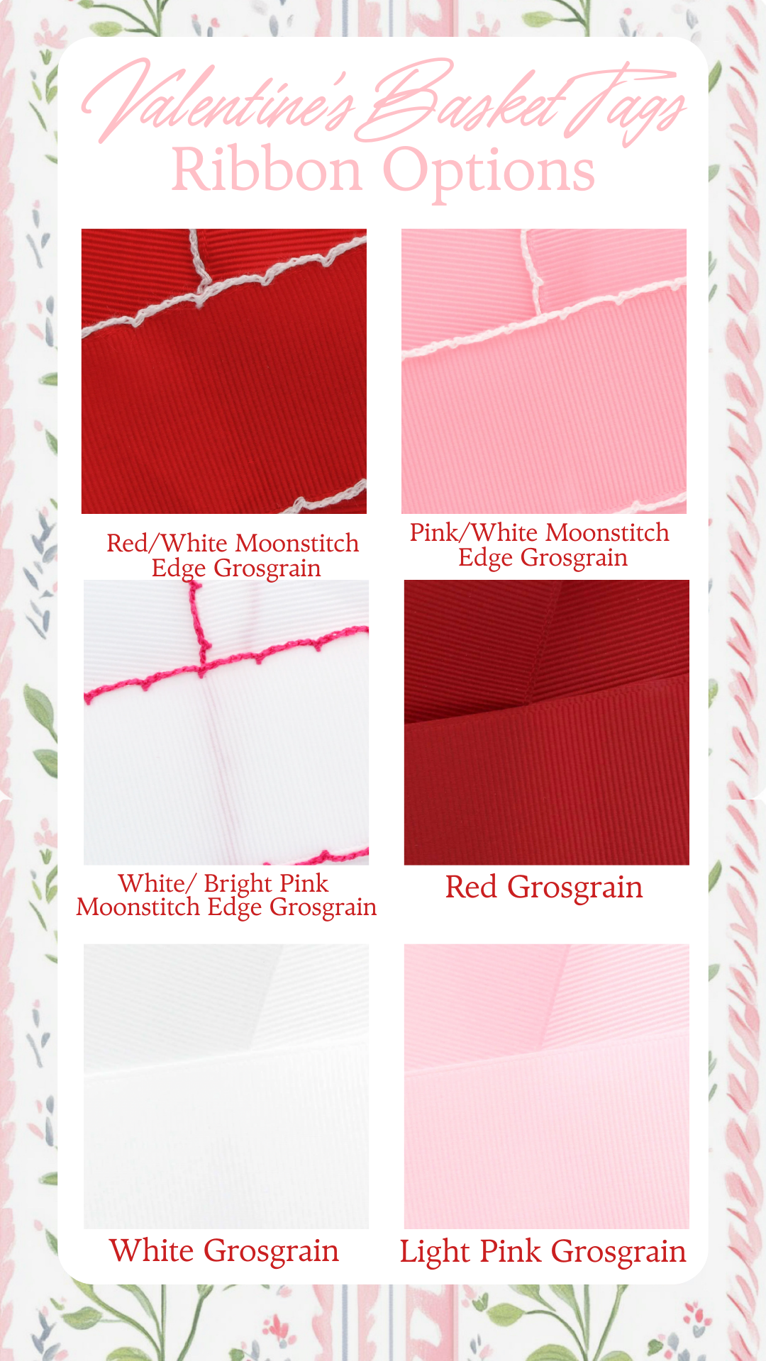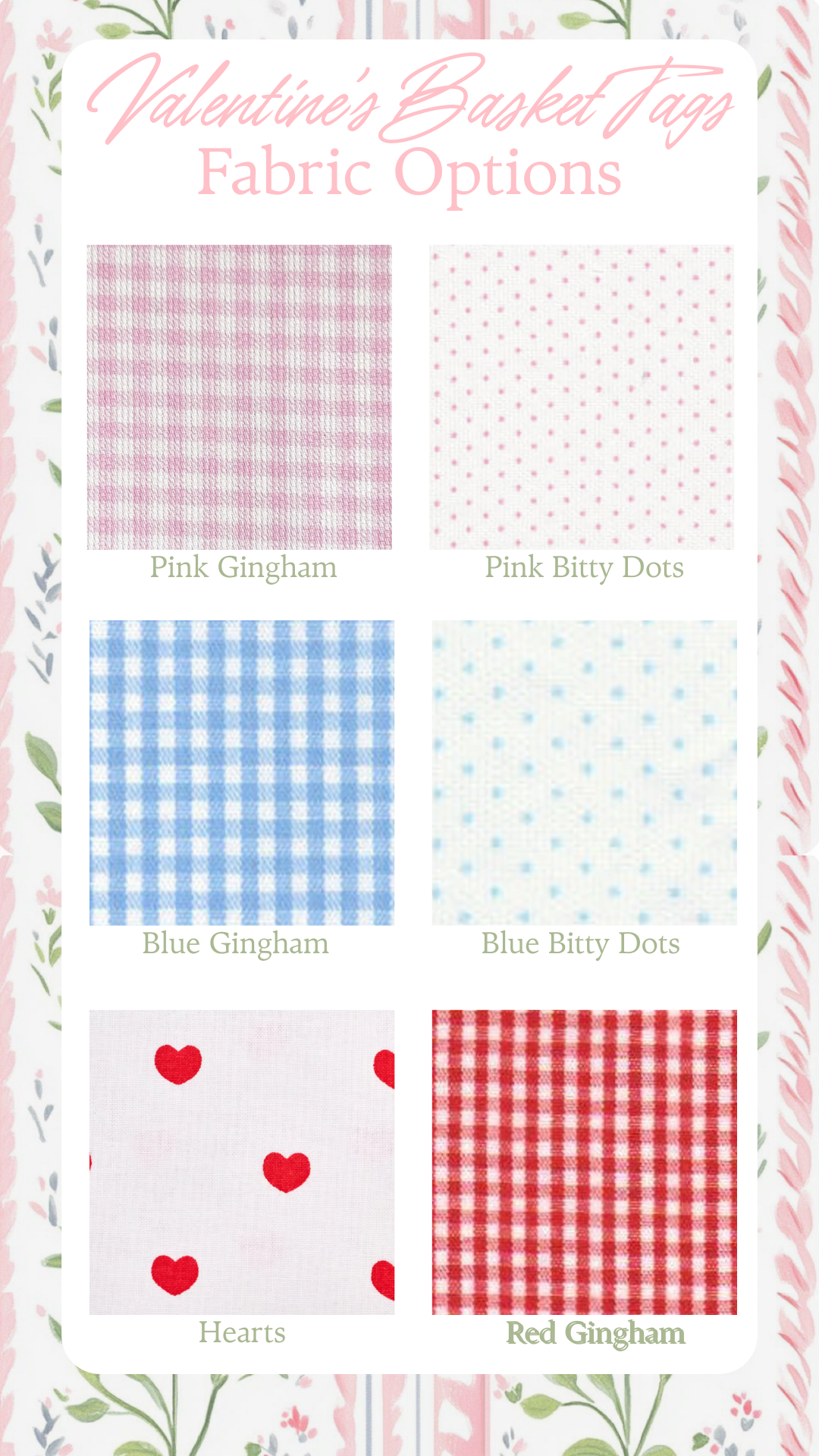 These valentine basket tags are perfect for making Valentine's Day extra special for your little one! They are customizable with the fabric and ribbon choices. Make sure to note which fabric you would like for the inner heart and outer heart if you have a preference!