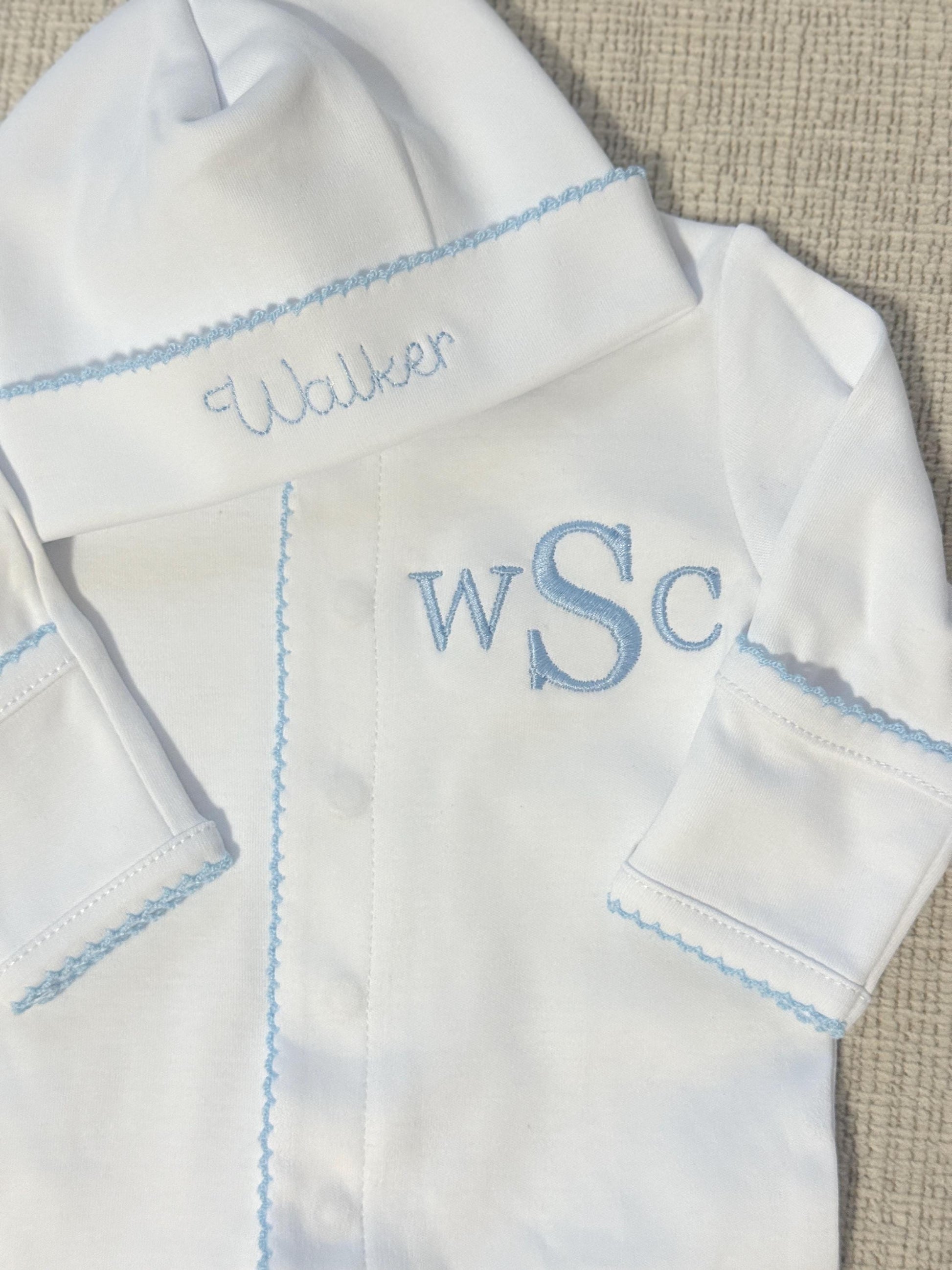 Each piece is custom embroidered with your little ones monogram! Ideal for baby’s coming home photos, newborn photos, or as a baby shower gift!